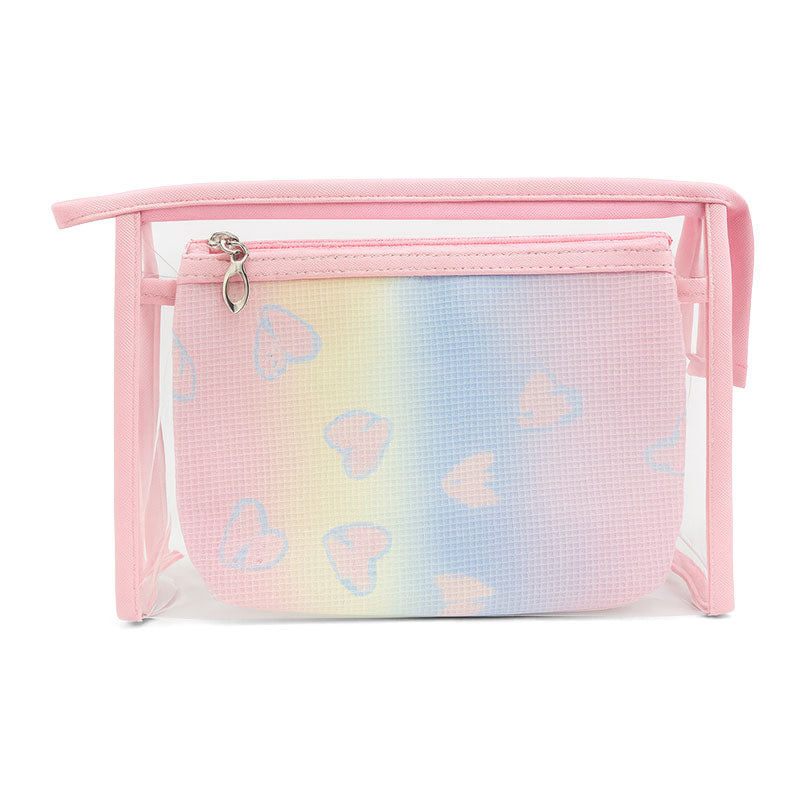 Stylish transparent pouch with a pastel heart-print inner bag, perfect for makeup or travel essentials. The large pouch measures (23 cm × 17 cm) and the smaller one (20 cm × 14 cm), offering both organization and charm in one set.