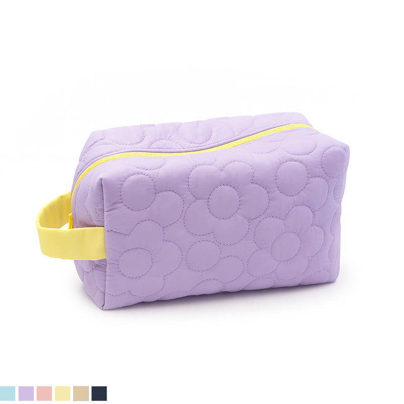 Soft quilted pouch with a delicate flower pattern and colorful zipper accent. Perfect for storing makeup, skincare, or travel essentials. Features a comfortable side handle and comes in multiple pastel shades (20 cm × 13 cm).